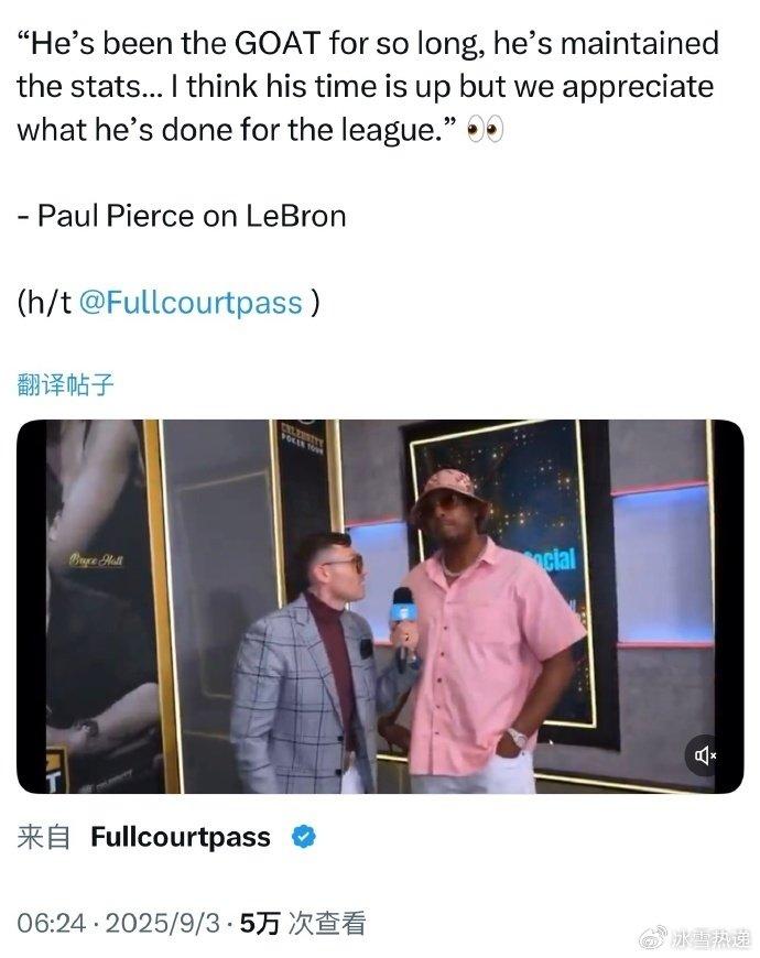 皮尔斯也是进一步表示:“詹姆斯已经是GOAT很久时间,他始终保持出色数据。我们感激他为这项运动带来的贡献,感激他从乔丹退役后,就扛起NBA联盟大旗。詹姆斯是NBA传奇之一,我们对此心怀感激,但我觉得他的时代该落幕了,我们会永远铭记他为NBA所做的一切。”